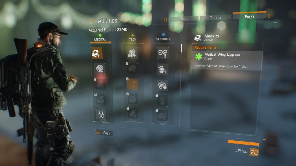 You have a base of operations which provides perks and a place to resupply. Part of the game involves completing the previously mentioned side-missions and encounters to collect supplies (Tech, Security, Medical) in order to upgrade your headquarters. There are currently 10 upgrades per wing and each provides new perks and upgrades to skills and parts of the headquarters. It’s a cool little mini-game addition that I’d miss if it weren’t present now that I’ve played it.